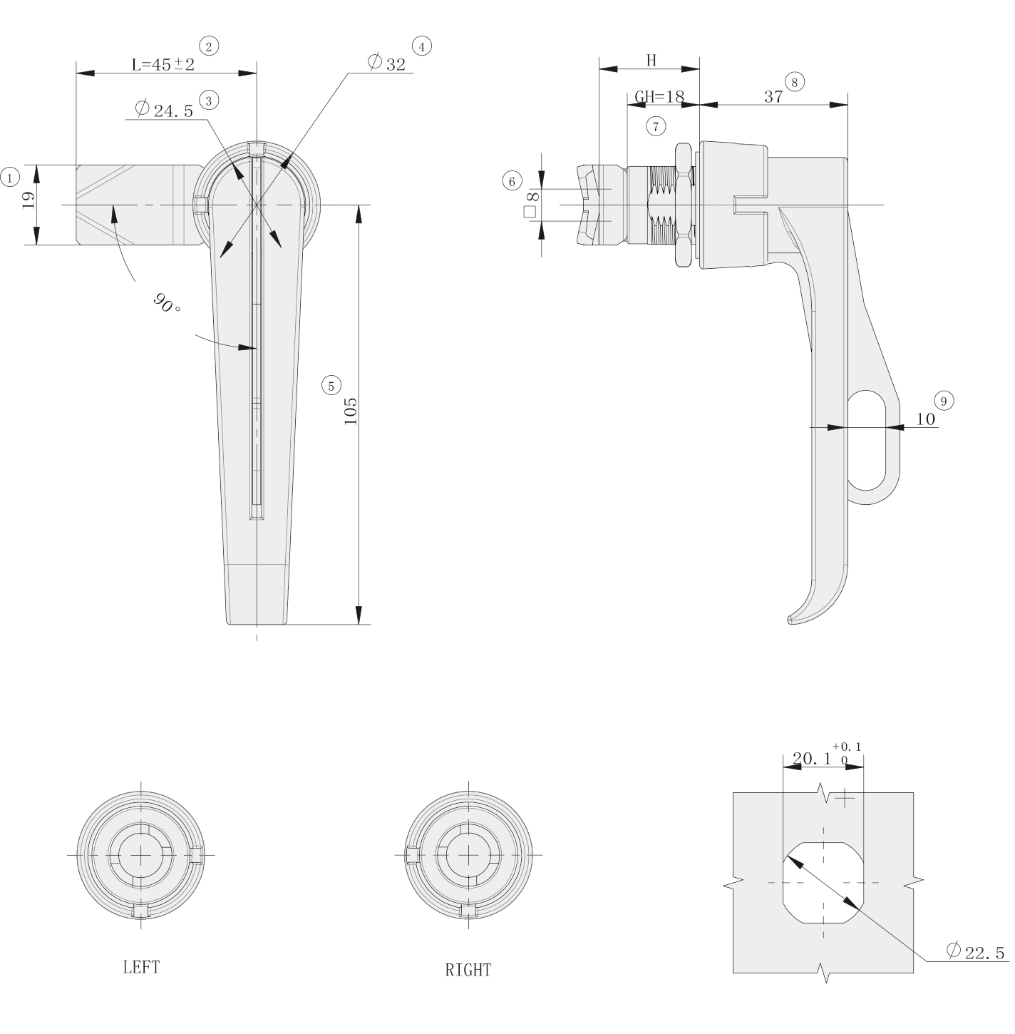Structure Description:Rotate the handle 90° to open or close; can be equipped with a padlock