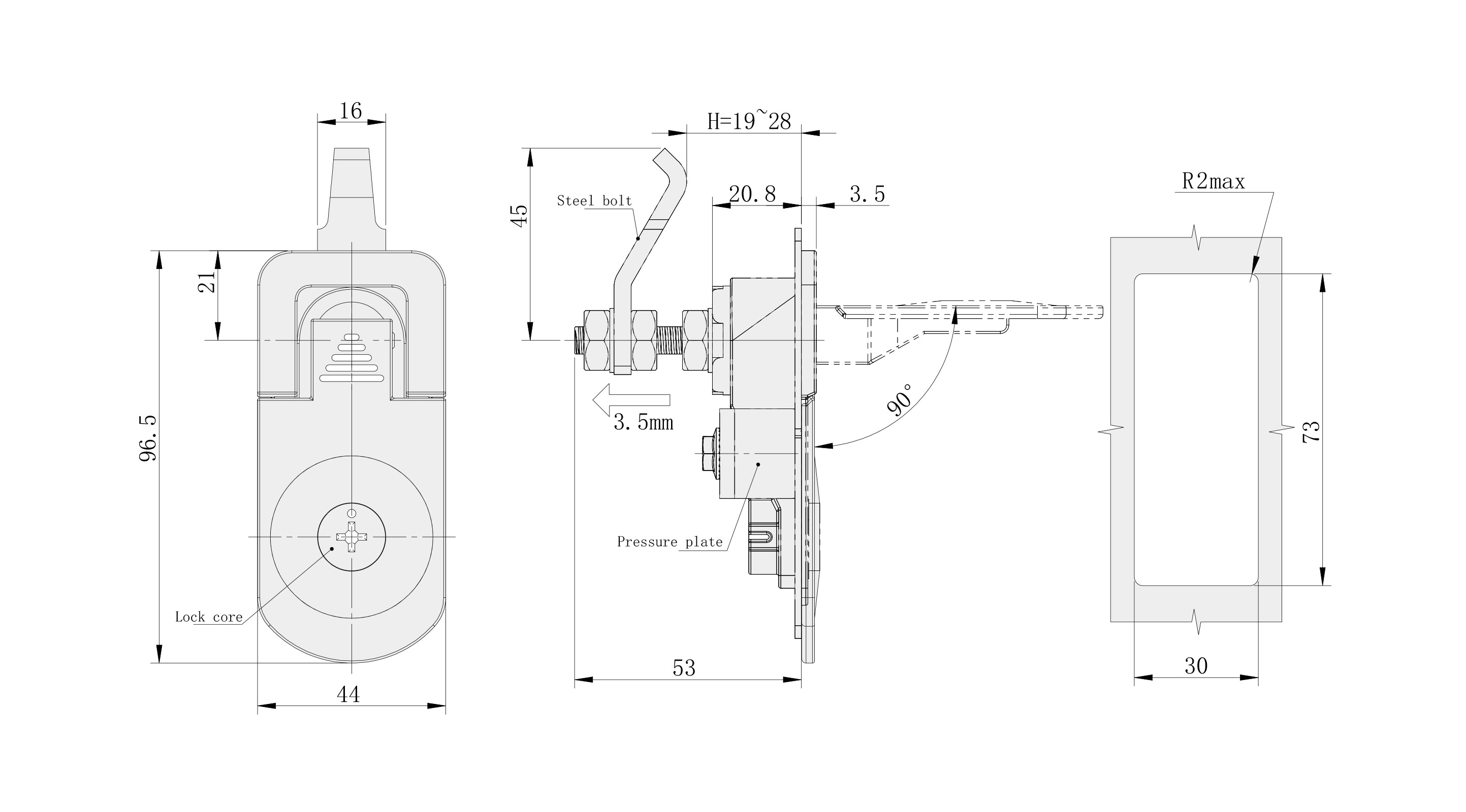 Surface Treatment: Spray black polished finish (base, handle, lock cylinder); galvanized pressure plate
